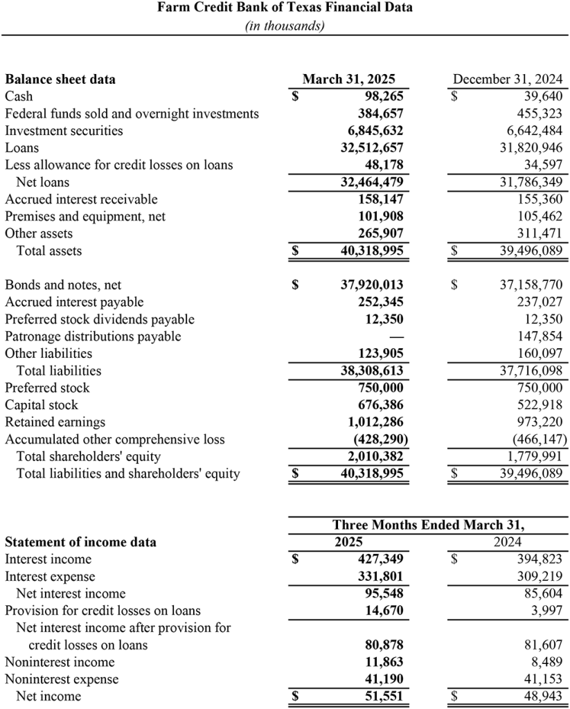AUSTIN, Texas – May 2, 2025 – Farm Credit Bank of Texas (FCBT) reported solid earnings, loan growth, and maintained strong credit quality in the first quarter of 2025.