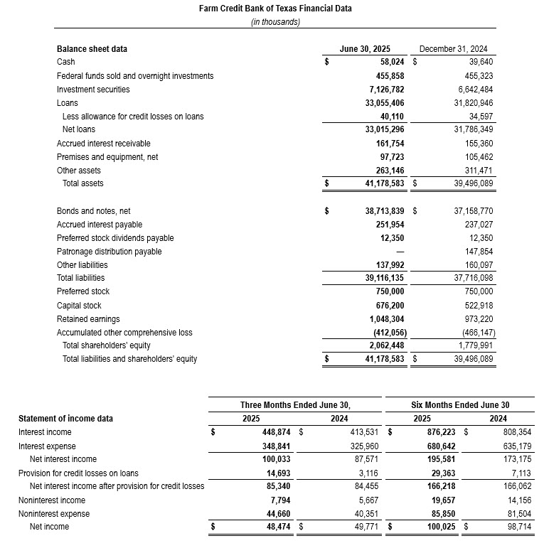 AUSTIN, Texas – August 1, 2025 – Farm Credit Bank of Texas (FCBT) reported solid earnings, loan growth, and sustained credit quality in the second quarter and first half of 2025.